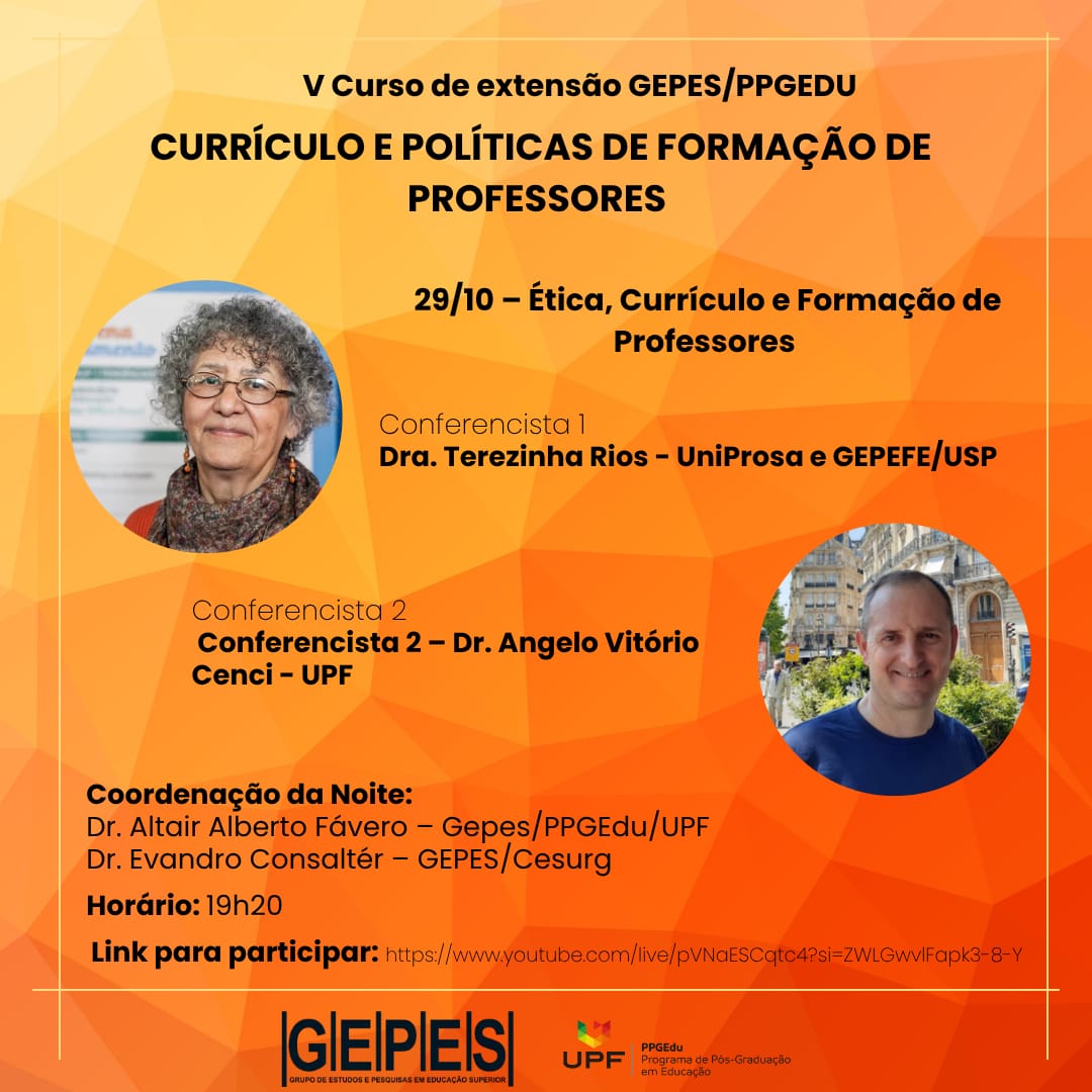 Na última quarta-feira, 29/10/25, tivemos o 3º Encontro do V Curso de Extensão cuja temática é Currículo e Formação de Professores, promovido pelo Grupo de Estudos e Pesquisas sobre Educação Superior (Gepes) em parceria com Programa de Pós Graduação em Educação (PPGEdu/UPF). Participam do curso mestrandos e doutorandos do PPGEdu, egressos, integrantes do Gepes, bolsistas, professores e gestores da educação básica de diversas regiões do Brasil. Ao todo são quase 100 participantes de mais de 50 municípios espalhados em mais 16 Estados da Federação.